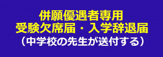 国士舘高校一般入試に合格し公立高校第一次入学者選抜に合格した併願優遇受験生は中学校の先生を通じて「辞退届」を提出してください。延納した一般公立受験生の入学辞退は保護者様からの「辞退届」提出です。延納した受験生の入学手続は公立合格発表日の翌日締切です。
