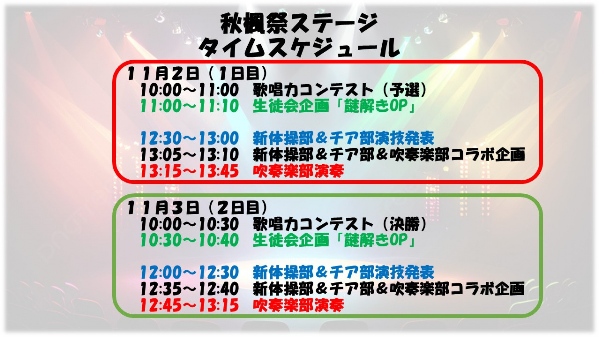 各クラスの展示や部活が出店する露店、部活動の演技発表などをお楽しみください。