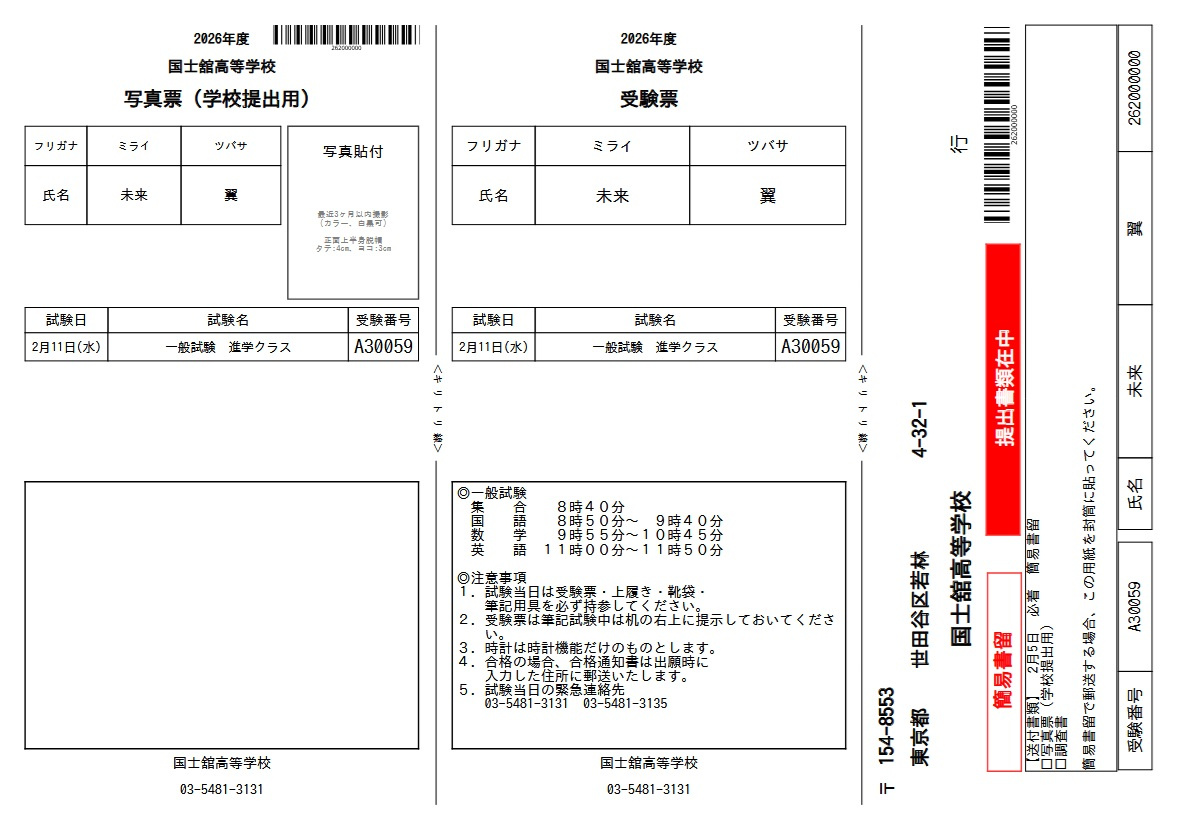 *受験票の例(進学クラス)です。