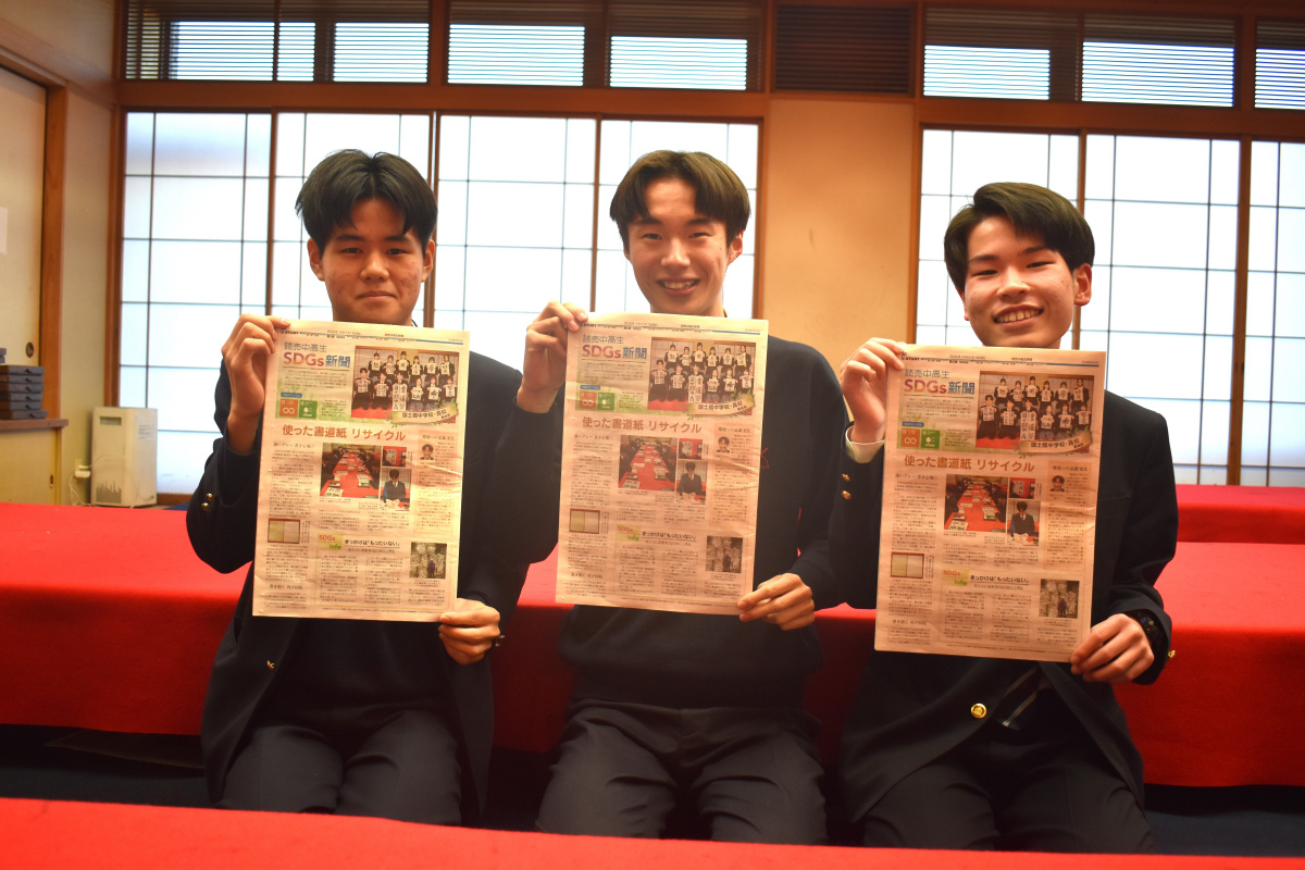 書道の授業や書道部の活動に、使用済み半紙をリサイクルしたエコ半紙「未来箋」を導入しています。本校では書いた半紙をそのまま捨てずにリサイクルし、「未来箋」として生まれ変わった半紙で作品を書いています。その活動がSDGsの一環として年末に取材され、1月9日に発行された読売中高生新聞に掲載されました。